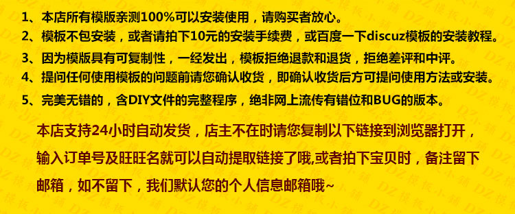 【郑重声明】:因模板价格极低,#模板不提供技术支持#。模板安装需要有一定的使用discuz经验,新手以及不接受者勿拍。需要协助安装的可以拍店内协助安装9元,安装不好全额退款。